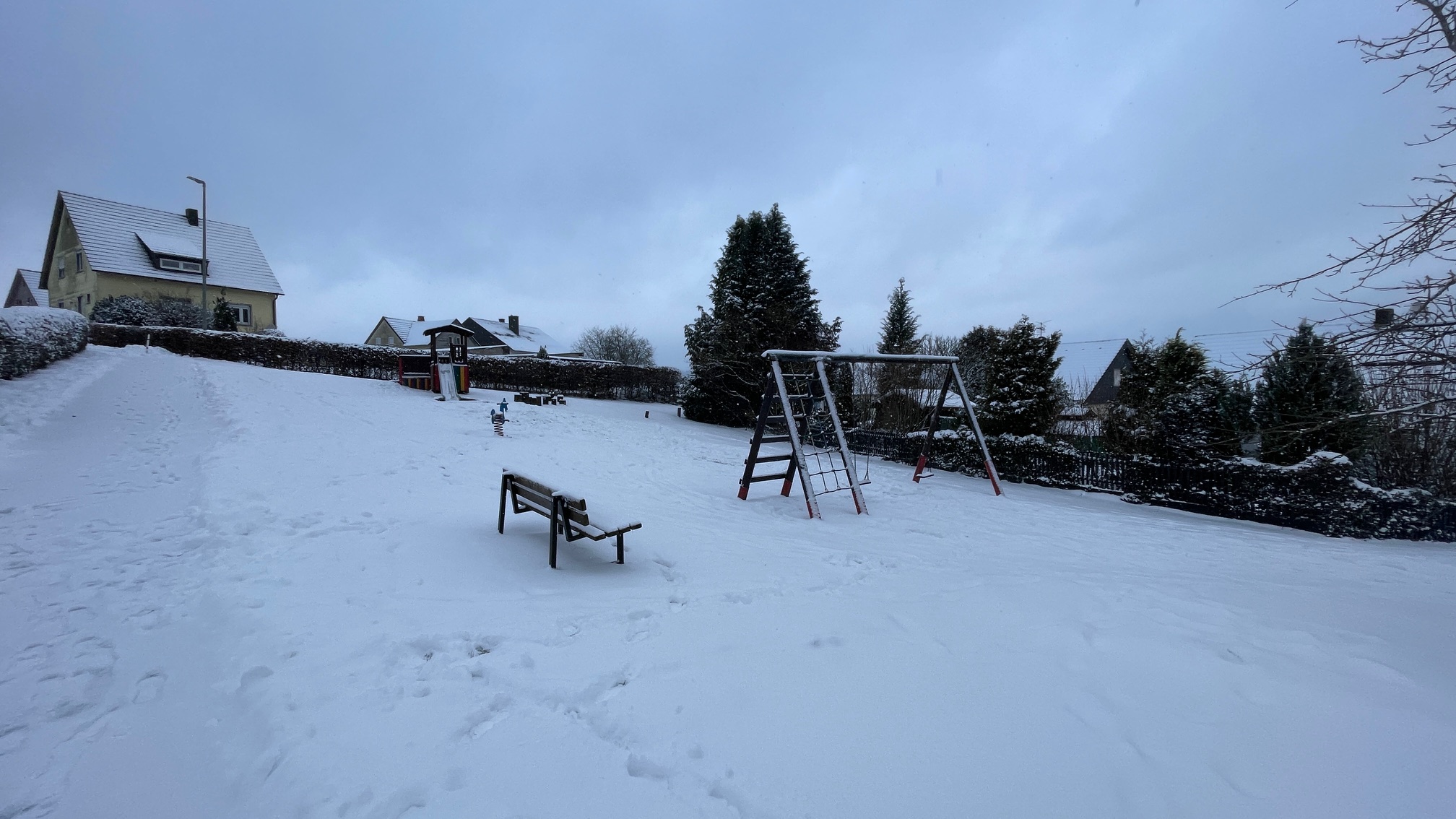 Schnee wohin das Auge reicht, auch auf dem Schmißberger Spielplatz.